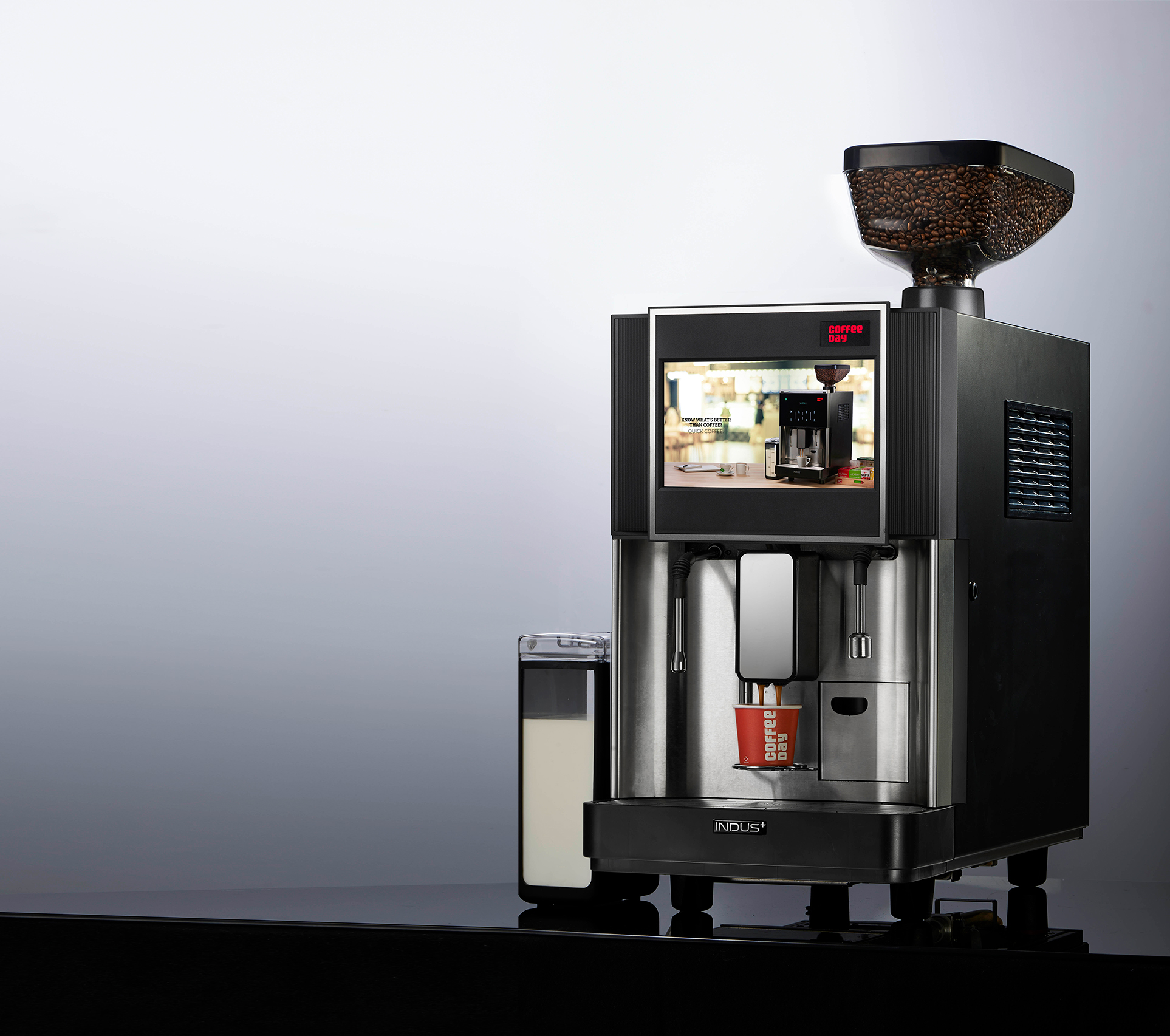 The Indus Plus coffee brewer is designed with contemporary premium aesthetics. A glossy black display system comes alive with a spot illumination for cups. The cup stand can accommodate different cup sizes and swivels with ease.